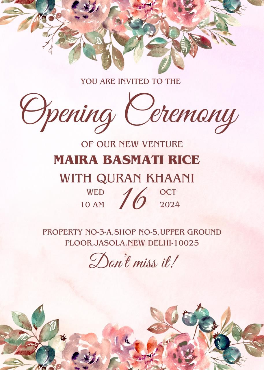 We are thrilled to announce the grand opening of our new venture, Maira Basmati Rice, and we want you to be part of this joyous occasion! Join us for the opening ceremony on Wednesday, October 16, 2024, at 10 AM at our new location: Property No-3-A, Shop No-5, Upper Ground Floor, Jasola, New Delhi-10025.